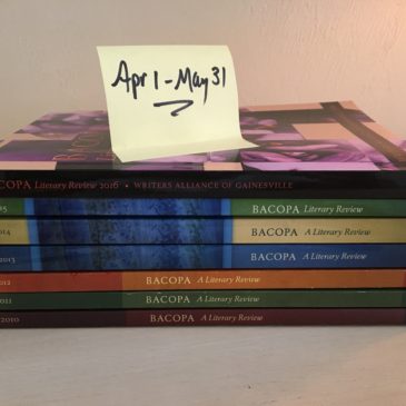 Bacopa Literary Review This year’s Bacopa Literary Review contest submissions will be open until May 31, 2018, with a $250 prize in each of four genres: Short Story, Creative Nonfiction, Poetry, Prose Poetry. Every author published will also receive $25. The $3 submission fee is waived for WAG members’ first submission. We’re looking for … Read More