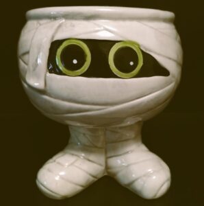 For the first time I could see my visitor clearly. Poor chap had obviously been involved in a dreadful accident; bandages swathed him from head to toe. His eyes glowed red from slits cut in the rotten fabric.