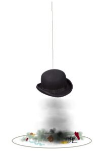 Dillemuth’s designs were of drywall chunks, coins, broken dolls, jewelry fragments, and so on, looking much like the aftermath of an earthquake. My favorite piece featured a hat suspended from the ceiling. It hovered over a pile of detritus, the shadow of the hat swaying across a pile of junk: a torn-up wallet, a shoe, a purse, coins, bits of bones.