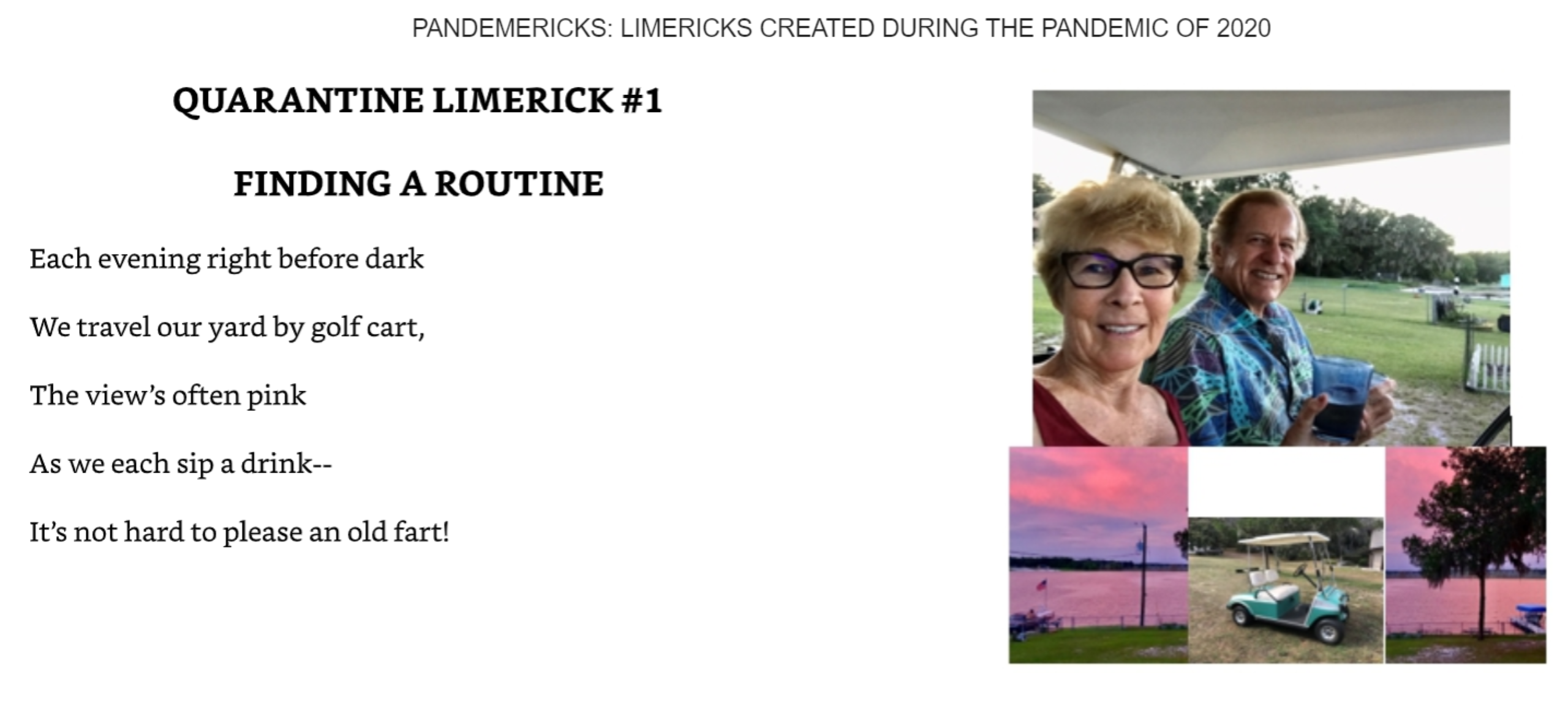 Each limerick in Pandemericks: Limericks Created During the Pandemic of 2020 is accompanied by personal photos, and Ginny has graciously allowed us to post a sample here: