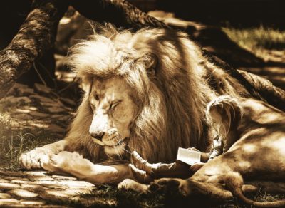 While Adam—yes, that’s his name—told his story, the women ate a great deal because they didn’t have to share it with the men, who were all dead. They grew bored and fell asleep, all except one. She was very excited listening to Adam’s story. Her heart beat loudly. She felt like screaming, but she clasped her hand over her mouth because she didn’t want the lion to hear her. Sweat broke out on her forehead. When Adam finished, she was so thrilled she jumped up and ran to him to congratulate him and shake his hand and other parts, and they made lots of babies. I guess you know her name.